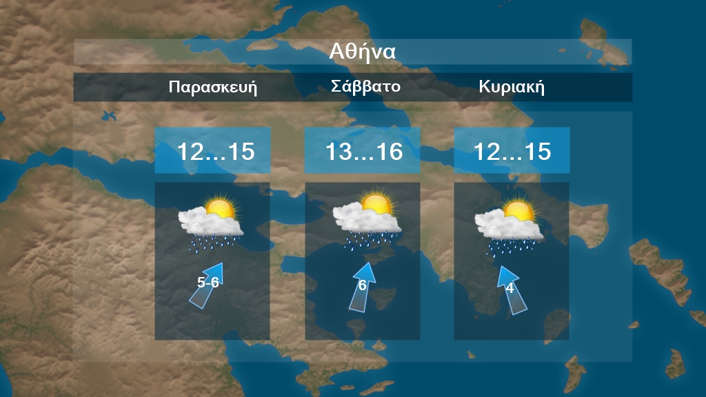 Στην Αττική προβλέπονται λίγες νεφώσεις πρόσκαιρα αυξημένες. Οι άνεμοι θα πνέουν νότιοι νοτιοδυτικοί 6 με 7 και στα ανατολικά τοπικά 8 μποφόρ και η θερμοκρασία θα κυμανθεί από 14 έως 20 βαθμούς Κελσίου.