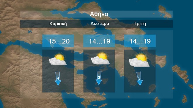 Στην Αττική προβλέπονται αυξημένες νεφώσεις με τοπικές βροχές κυρίως στα ανατολικά και τα βόρεια, όπου είναι πιθανό πρόσκαιρα να εκδηλωθούν και μεμονωμένες καταιγίδες. Οι άνεμοι θα πνέουν Βόρειοι βορειοανατολικοί 4 με 6 μποφόρ, με εξασθένηση το βράδυ. Η θερμοκρασία θα κυμανθεί από 11 έως 17 βαθμούς Κελσίου.