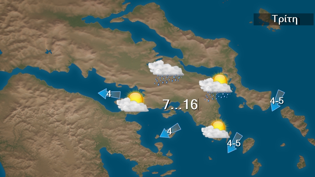 Στην Αττική προβλέπονται νεφώσεις παροδικά αυξημένες, με τοπικές βροχές. Οι άνεμοι θα πνέουν αρχικά νότιοι 3 με 4 και από το βράδυ βορειοανατολικοί 4 με 5 μποφόρ. Η θερμοκρασία θα κυμανθεί από 7 έως 16 βαθμούς Κελσίου.