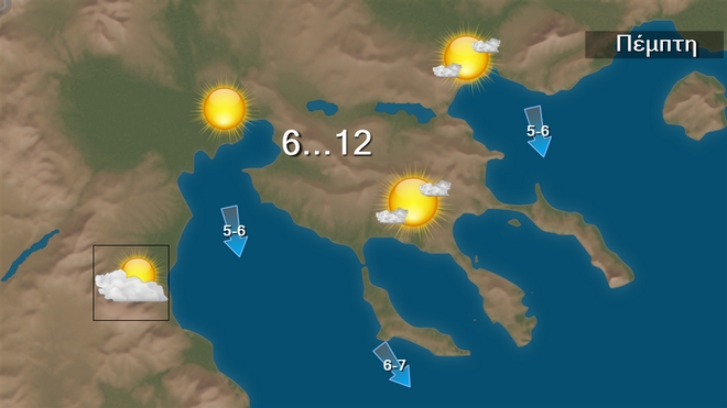 Την Πέμπτη στα δυτικά ο καιρός θα είναι γενικά αίθριος με λίγες πρόσκαιρες νεφώσεις. Στην υπόλοιπη χώρα προβλέπονται αυξημένες νεφώσεις με τοπικές βροχές και στα νοτιοανατολικά σποραδικές καταιγίδες. Τα φαινόμενα στις Κυκλάδες, την Κρήτη και τα Δωδεκάνησα μέχρι το μεσημέρι θα είναι κατά τόπους ισχυρά. Χιονοπτώσεις θα σημειωθούν στα ορεινά της Κρήτης, ενώ πρόσκαιρα θα χιονίσει και στα ορεινά της κεντρικής και βόρειας ηπειρωτικής χώρας και της Εύβοιας. Από το μεσημέρι τα φαινόμενα στα βόρεια θα σταματήσουν και στις υπόλοιπες περιοχές θα εξασθενήσουν. Οι άνεμοι θα πνέουν από βόρειες διευθύνσεις 5 με 7 και στο Αιγαίο 8 μποφόρ. Από το απόγευμα στα δυτικά οι άνεμοι θα εξασθενήσουν. Η θερμοκρασία θα σημειώσει μικρή πτώση στα ανατολικά. Στα βόρεια ηπειρωτικά δεν θα ξεπεράσει τους 10 με 12 βαθμούς και στα υπόλοιπα ηπειρωτικά και τα νησιά θα φτάσει τους 13 με 16 βαθμούς Κελσίου. Κατά τόπους παγετός θα σημειωθεί τις πρωινές και βραδινές ώρες στα βορειοδυτικά.