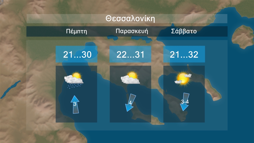 Στη Θεσσαλονίκη προβλέπονται νεφώσεις παροδικά αυξημένες με τοπικούς όμβρους κυρίως τις μεσημβρινές και απογευματινές ώρες. Άνεμοι μεταβλητοί 3 με 4μπ. Θερμοκρασία από 18 έως 29 βαθμούς Κελσίου.