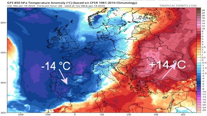 Ήδη οι θερμοκρασίες στις κατώτερες στάθμες της ατμόσφαιρας (στη στάθμη των 850 hPa) βρίσκονται κατά 8 έως 14 βαθμούς κάτω από τα συνήθη επίπεδα, σε Ισπανία και Νότια Γαλλία, ενώ στον αντίποδα βρίσκονται οι χώρες της ανατολικής Ευρώπης, όπου τοπικά οι θερμοκρασίες βρίσκονται κατά 10 με 14 βαθμούς πάνω από τις συνηθισμένες για την εποχή τιμές.