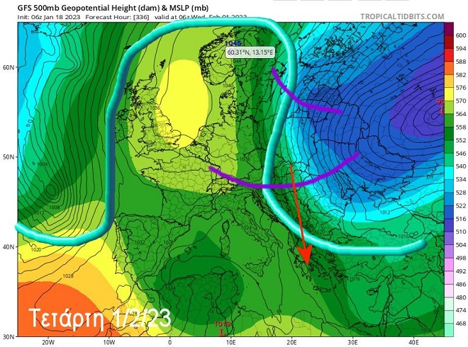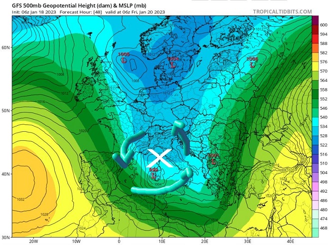Καθοριστικό ρόλο για πολλά φαινόμενα στη Κεντρική Μεσ3σόγειο θα διαδραματίσει η ψυχρή μάζα που θα κατέβει από τη ΒΔ Ευρώπη και η ο οποία θα δημιουργήσει ένα ισχυρό βαρομετρικό χαμηλό στο Τυρρηνικό πέλαγος, το οποίο θα στροβιλίζεται και θα προσκαλεί έντονες βροχές, θυελλώδεις ανέμους αλλά και χιόνια στη γειτονική Ιταλία και τα βορειοδυτικά Βαλκάνια.