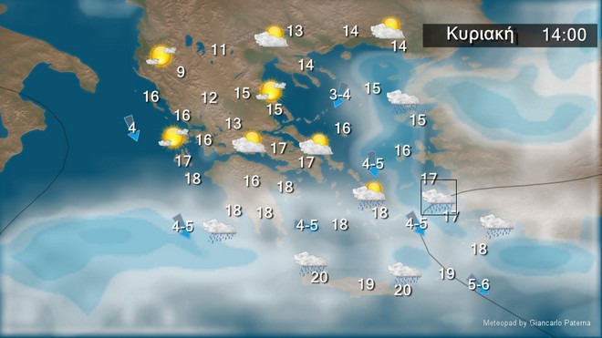 Λίγες νεφώσεις, παροδικά αυξημένες στα δυτικά, τη νότια και ανατολική νησιωτική χώρα όπου θα σημειωθούν τοπικές βροχές, γενικά ασθενείς. Οι άνεμοι θα πνέουν δυτικοί βορειοδυτικοί 3 με 5 και στα νότια τοπικά 6 μποφόρ. Η θερμοκρασία δεν θα σημειώσει αξιόλογη μεταβολή.