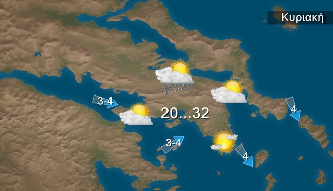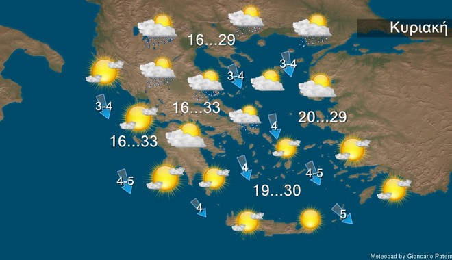 ώρες, οπότε θα εκδηλωθούν τοπικοί όμβροι και στα ορεινά μεμονωμένες καταιγίδες. Οι άνεμοι θα πνέουν μεταβλητοί 3 με 4 και στα πελάγη βορειοδυτικοί 4 με 5 μποφόρ. Η θερμοκρασία θα φτάσει στα βόρεια τους 29 βαθμούς στο Ιόνιο και τα υπόλοιπα ηπειρωτικά τους 33 βαθμούς και στα νησιά του Αιγαίου τους 29 με 30 βαθμούς Κελσίου