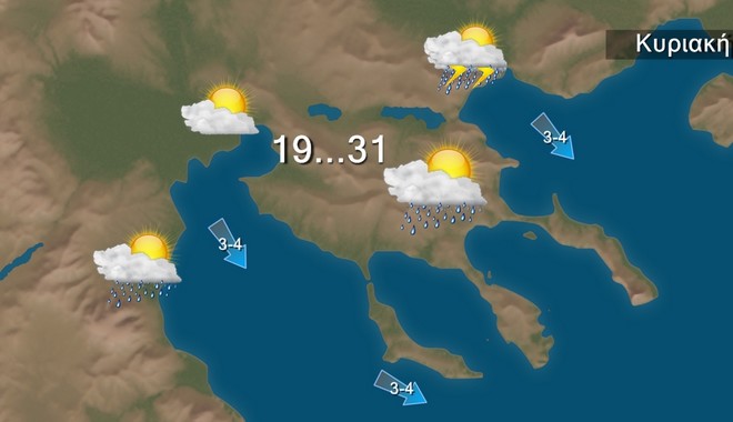 Την Κυριακή στη κεντρική, την ανατολική Μακεδονία και τη Θράκη προβλέπονται νεφώσεις παροδικά αυξημένες με τοπικές βροχές και κυρίως τις μεσημβρινές και απογευματινές ώρες σποραδικές καταιγίδες. Τα φαινόμενα το βράδυ θα σταματήσουν.