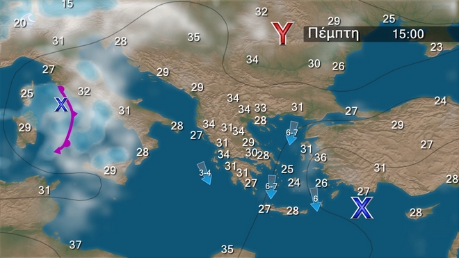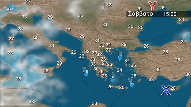 Γενικά αίθριος καιρός. Τις μεσημβρινές και απογευματινές ώρες στα δυτικά και βόρεια ηπειρωτικά θα αναπτυχθούν τοπικές νεφώσεις και πιθανόν στα βόρεια ορεινά να εκδηλωθούν τοπικοί όμβροι. Οι άνεμοι θα πνέουν από βόρειες διευθύνσεις στα δυτικά 3 με 5, στα ανατολικά 4 με 6 και στο Αιγαίο κατά τη διάρκεια της ημέρας τοπικά 7 μποφόρ. Η θερμοκρασία δεν θα σημειώσει αξιόλογη μεταβολή.