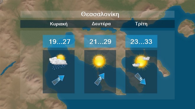 Στη Θεσσαλονίκη προβλέπεται αστάθεια την Κυριακή. Η θερμοκρασία θα έχει μέγιστες τιμές περί τους 27 με 33 βαθμούς Κελσίου.