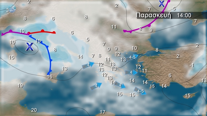 Λίγες νεφώσεις παροδικά αυξημένες, με τοπικές βροχές τις πρωινές ώρες στα δυτικά και το ανατολικό Αιγαίο. Οι άνεμοι θα πνέουν δυτικοί βορειοδυτικοί 4 με 6, στα νότια πελάγη τοπικά 7 μποφόρ με βαθμιαία εξασθένηση. Η θερμοκρασία θα σημειώσει μικρή πτώση κυρίως ως προς τις ελάχιστες τιμές, οπότε στα βόρεια ηπειρωτικά τις πρωινές και βραδινές ώρες αναμένεται κατά τόπους παγετός.