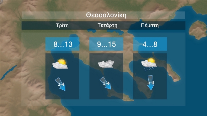 Παροδικές νεφώσεις προβλέπονται στη Θεσσαλονίκη το επόμενο τριήμερο και λίγες βροχές την Πέμπτη . Η θερμοκρασία θα φτάσει περί τους 15 βαθμούς Κελσίου την Τετάρτη , αλλά θα πέσει στους 8 στη Θεσσαλονίκη.