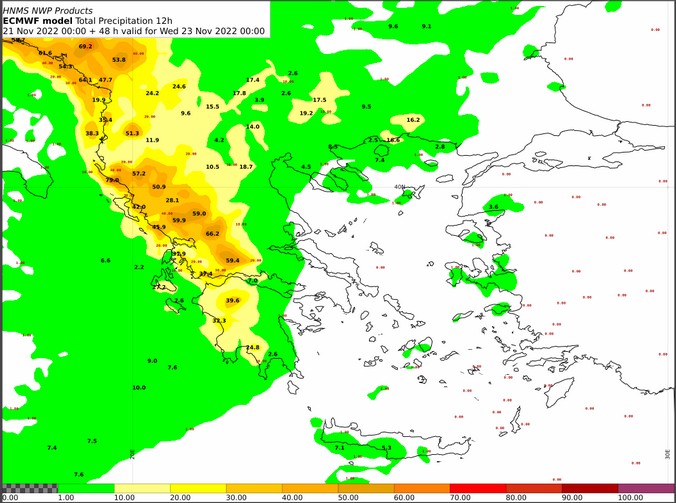 1. Από το απόγευμα την Τρίτης (22-11-2022) και μέχρι τις πρωινές ώρες της Τετάρτης (23-11-2022) ισχυρές βροχές και καταιγίδες προβλέπονται στα νησιά του Ιονίου, την Ήπειρο, τη δυτική Στερεά και τη δυτική και νότια Πελοπόννησο. Τα φαινόμενα σταδιακά θα παρουσιάσουν εξασθένηση.