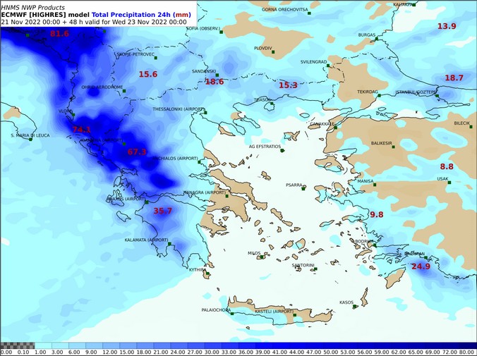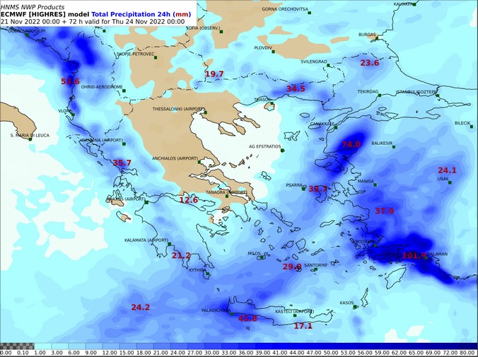 Στον επόμενο χάρτη παρουσιάζονται τα 24ωρα ύψη βροχής που εκτός από τις περιοχές της δυτικής Ελλάδος περιλαμβάνουν το Ανατολικό Αιγαίο τις Κυκλάδες την Κρήτη και μέρος της Δωδεκανήσου.