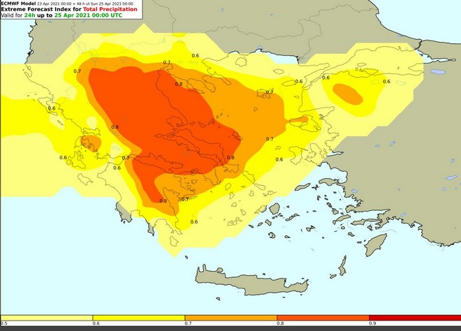Οι ισχυρές βροχές που θα εκδηλωθούν το Σάββατο θα επηρεάσουν τη δυτική και την κεντρική Μακεδονία, τη Θεσσαλία, τις Σποράδες, την ανατολική Στερεά και βαθμιαία την Εύβοια. Στον παραπάνω χάρτη με τον δείκτη Extreme Forecast Index ( EFI ) παρουσιάζονται οι περιοχές που θα επηρεαστούν περισσότερο όλο το 24ωρο του Σαββάτου