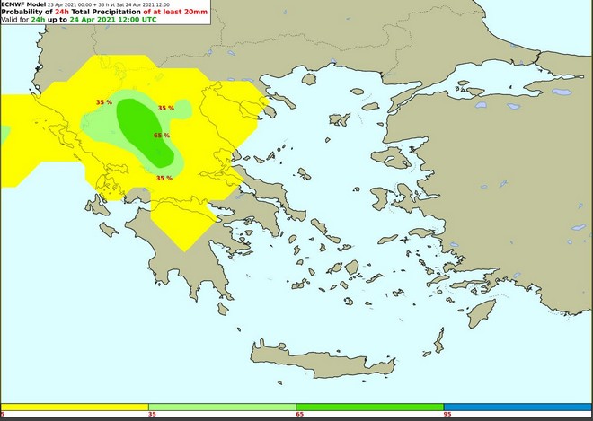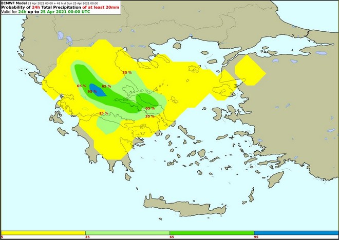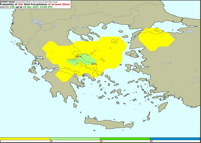 Με το ίδιο σκεπτικό παρουσιάζονται παραπάνω οι περιοχές και οι πιθανότητες που υπάρχουν για πάνω απο 20 mm βροχής το 24ωρο απο Σάββατο 00:00 έως Κυριακή 00:00 UTC