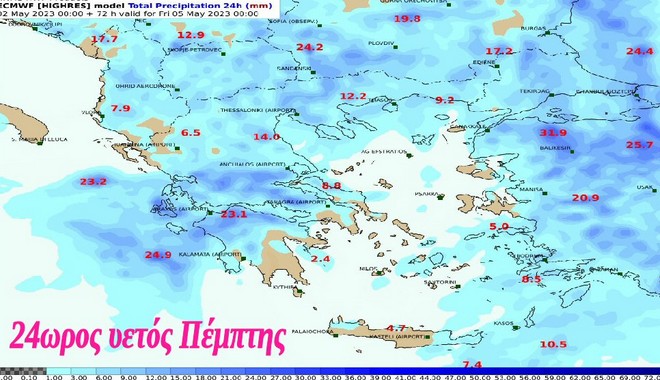 Την Πέμπτη (04-05-2023) τα φαινόμενα θα εξασθενήσουν, ωστόσο ο καιρός θα διατηρηθεί άστατος, με βροχές και καταιγίδες πιθανώς κατά τόπους ισχυρές στο Ιόνιο τις πρωινές ώρες και στα ηπειρωτικά το μεσημέρι – απόγευμα.