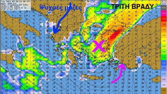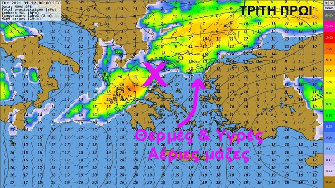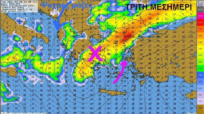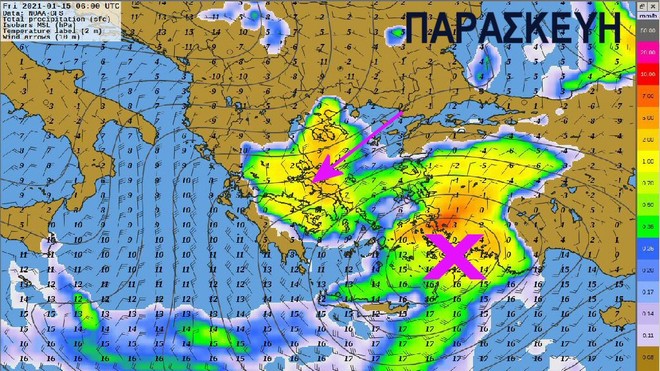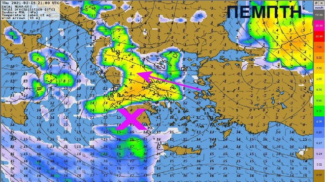 Μετά την Μεγάλη πτώση της θερμοκρασίας από βορρά προς νότο την Τετάρτη θα δημιουργηθεί ένα βαρομετρικό χαμηλό στο Αιγαίο που το διήμερο Πέμπτης Παρασκευής με το ανατολικό επιφανειακό ρεύμα θα μεταφέρει υγρασία από το Αιγαίο στα ηπειρωτικά με αποτέλεσμα πλέον τις χιονοπτώσεις σε όλη σχεδόν τη Κεντρική και τη Βόρεια Ελλάδα , όχι μόνο στα ορεινά και ημιορεινά αλλά και σε περιοχές με χαμηλότερο υψόμετρο.