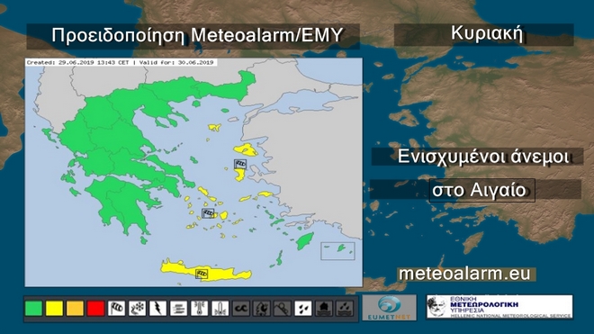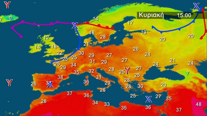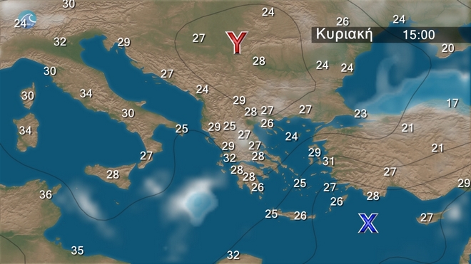 Την Κυριακή προβλέπεται γενικά αίθριος καιρός και μόνο στα ανατολικά και τα βόρεια μέχρι τις απογευματινές ώρες θα υπάρχουν νεφώσεις παροδικά αυξημένες. Οι άνεμοι θα πνέουν στα δυτικά από ανατολικές διευθύνσεις 4 με 5 μποφόρ που το απόγευμα θα στραφούν σε βόρειους βορειοδυτικούς με την ίδια ένταση. Στα ανατολικά από βόρειες διευθύνσεις 5 με 7 και στο Αιγαίο τοπικά 8 μποφόρ. Η θερμοκρασία σε μικρή πτώση στα ανατολικά θα φτάσει στα βόρεια ηπειρωτικά τους 30 βαθμούς στα δυτικά και τα υπόλοιπα ηπειρωτικά τους 34 και 32 βαθμούς αντίστοιχα και στα νησιά του Αιγαίου τους 28 με 31 βαθμούς Κελσίου.