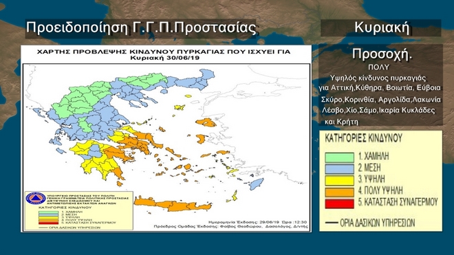 Από πλευράς καιρού δεν υπάρχει κάτι ιδιαίτερο όμως τοπικά όμως θα έχουμε πολύ υψηλή κατηγορία κινδύνου για πυρκαγιές για Αττική, Κύθηρα, Βοιωτία, Εύβοια, Σκύρο, Κορινθία, Αργολίδα, Λακωνία, Λέσβο, Χίο, Σάμο, Ικαρία, Κυκλάδες Κρήτη σύμφωνα με την πρόβλεψη της Γενικής Γραμματείας Πολιτικής Προστασίας.