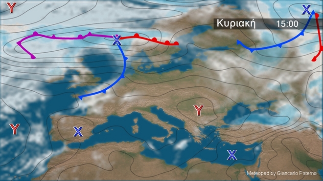 Στον γενικό χάρτη της Ευρώπης διακρίνεται ο ισχυρός αντικυκλώνας στα Βαλκάνια που προκαλεί τον ισχυρό συνδυασμό με το χαμηλό και έχουμε δυνατό μελτέμι στο Αιγαίο.