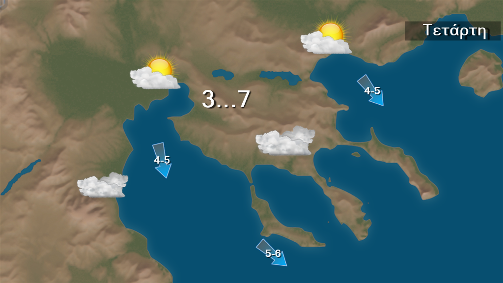 Σήμερα Τετάρτη στα ανατολικά ηπειρωτικά, τις Σποράδες, την Εύβοια, τις Κυκλάδες, την Κρήτη, τα νησιά του ανατολικού Αιγαίου και τα Δωδεκάνησα προβλέπονται τοπικές βροχές. Σποραδικές καταιγίδες θα εκδηλωθούν τις πρωινές ώρες στις Κυκλάδες και τα Δωδεκάνησα. Τα φαινόμενα βαθμιαία θα εξασθενήσουν. Πρόσκαιρες χιονοπτώσεις θα σημειωθούν στα ορεινά της ανατολικής ηπειρωτικής χώρας και της Κρήτης. Στα υπόλοιπα προβλέπονται λίγες νεφώσεις παροδικά αυξημένες. Οι άνεμοι θα πνέουν από βόρειες διευθύνσεις στα δυτικά 3 με 5, στα ανατολικά 4 με 6 και στο Αιγαίο 7 με 8 μποφόρ με βαθμιαία εξασθένηση από το απόγευμα. Η θερμοκρασία θα φθάσει στα βόρεια τους 9 βαθμούς, στα ανατολικά ηπειρωτικά τους 13 και στα δυτικά και στην ανατολική νησιωτική χώρα τους 16 βαθμούς Κελσίου. Τις πρωινές και βραδινές ώρες θα σημειωθεί τοπικά παγετός στα κεντρικά και βόρεια ηπειρωτικά.