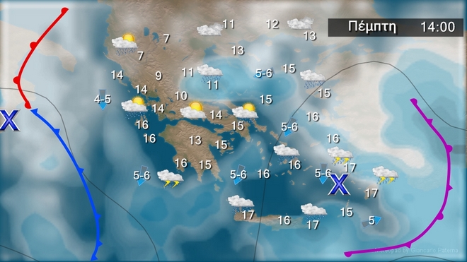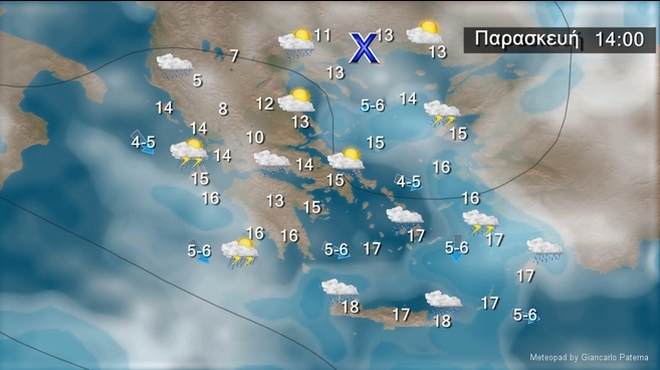 Στα δυτικά λίγες νεφώσεις που βαθμιαία θα αυξηθούν και μετά το μεσημέρι θα εκδηλωθούν τοπικές βροχές και στο Ιόνιο μεμονωμένες καταιγίδες. Στην υπόλοιπη χώρα νεφώσεις με τοπικές βροχές και σποραδικές καταιγίδες πρόσκαιρα ισχυρές τις πρώτες πρωινές ώρες στη Θεσσαλία, τις Σποράδες, την Κρήτη, τις Κυκλάδες, τα νησιά του ανατολικού Αιγαίου και τα Δωδεκάνησα θα σημειωθούν. Πρόσκαιρες χιονοπτώσεις θα σημειωθούν στα κεντρικά και βόρεια ορεινά. Τα φαινόμενα από το μεσημέρι βαθμιαία θα εξασθενήσουν. Οι άνεμοι στα δυτικά, κεντρικά και βόρεια θα πνέουν από βόρειες διευθύνσεις 4 με 6 μποφόρ. Στα υπόλοιπα θα πνέουν από νότιες διευθύνσεις 4 με 6, που βαθμιαία θα στραφούν σε δυτικούς βορειοδυτικούς 3 με 5 μποφόρ.