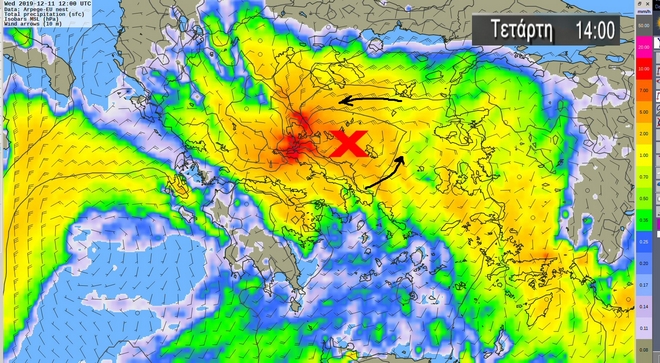 Αν μου ζητούσαν πάντως με μια εικόνα να περιέγραφα τον καιρό της Τετάρτης , θα έβαζα την παραπάνω που με μια ματιά μπορείτε να διακρίνετε τις περιοχές που χρειάζεται ιδιαίτερη προσοχή Στην Θεσσαλία την Ανατολική Στερεά τις Σποράδες και την Εύβοια δημιουργείται ένα βαρομετρικό χαμηλό που γύρω από αυτό συγκλίνουν άνεμοι από διαφορετικές διευθύνσεις . Στα νότια έχουμε νοτιοδυτικούς και στα βόρεια Ανατολικούς Βορειοανατολικούς. Το σημείο «συνάντησης» αερίων μαζών με διαφορετικά χαρακτηριστικά δημιουργεί μια μεγάλη ζώνη σύγκλισης κυρίως στη Θεσσαλία . Πολύ προσοχή σε αυτή την περιοχής και γύρω από αυτήν διότι το σύστημα παράλληλα κινείται από δυτικά προς Ανατολικά . Κατά τα άλλα Οι άνεμοι θα πνέουν στα βόρεια ανατολικοί βορειοανατολικοί 5 με 7 και στο βόρειο Αιγαίο 8 και τις πρώτες πρωινές ώρες πιθανώς 9 μποφόρ. Στα νότια θα πνέουν από νότιες διευθύνσεις 4 με 6 και στο νότιο Αιγαίο 7 με 8 μποφόρ, στρεφόμενοι από το απόγευμα στα δυτικά σε βόρειους 4 με 5 μποφόρ. Η θερμοκρασία θα σημειώσει αισθητή πτώση στα κεντρικά και βόρεια.