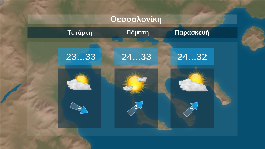 Στο βόρειο Ιόνιο και την Ήπειρο παροδικές νεφώσεις με τοπικές βροχές ή όμβρους, που από αργά το απόγευμα βαθμιαία θα σταματήσουν. Στις υπόλοιπες περιοχές γενικά αίθριος καιρός με πρόσκαιρες νεφώσεις στα ηπειρωτικά ορεινά και ημιορεινά κυρίως τις μεσημβρινές και απογευματινές ώρες, οπότε στα βόρεια ορεινά ενδέχεται να σημειωθούν τοπικοί όμβροι. Οι άνεμοι θα πνέουν δυτικοί νοτιοδυτικοί 4 με 5 και στα νότια τοπικά 6 μποφόρ. Η θερμοκρασία θα σημειώσει μικρή πτώση στα ανατολικά. Στα δυτικά ηπειρωτικά και τη νησιωτική χώρα θα φτάσει τους 29 με 32 βαθμούς Κελσίου. Στις υπόλοιπες περιοχές θα φτάσει τους 31 με 34 και κατά τόπους στη Θεσσαλία τους 35 βαθμούς.