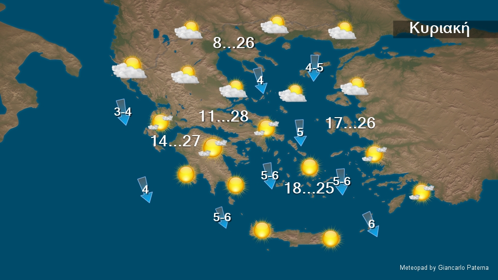 Γενικά αίθριος καιρός με λίγες αραιές νεφώσεις την Κυριακή. Εξασθένηση ανέμων και θερμοκρασία τοπικά στους 26 με 28 βαθμούς Κελσίου. Αναλυτικά η πρόγνωση του καιρού από τον διευθυντή της ΕΜΥ Θοδωρή Κολυδά