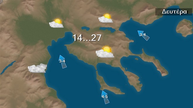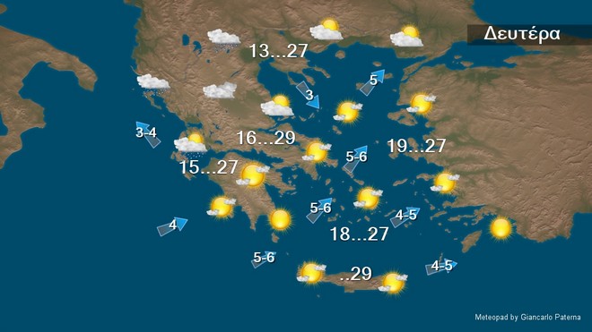 • Η θερμοκρασία θα έχει μέγιστες τιμές περί τους 27 βαθμούς στα βόρεια και τους 28 με 29 βαθμούς Κελσίου στην υπόλοιπη χώρα
