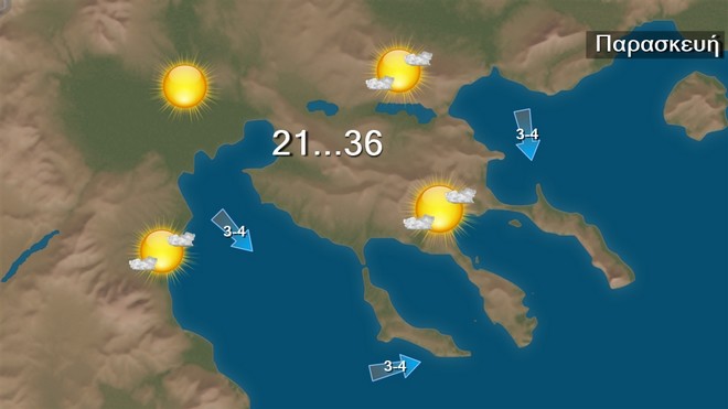 Την Παρασκευή σε όλη τη χώρα προβλέπεται γενικά αίθριος καιρός. Πρόσκαιρες νεφώσεις θα αναπτυχθούν τις μεσημβρινές και απογευματινές ώρες στα ορεινά κυρίως της βόρειας ηπειρωτικής χώρας με πιθανότητα τοπικών όμβρων στα βορειοδυτικά. Οι άνεμοι θα πνέουν από βόρειες διευθύνσεις 4 με 6 και τοπικά στο κεντρικό και βόρειο Αιγαίο έως 7 μποφόρ.