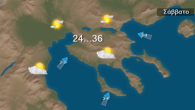 Το Σάββατο προβλέπεται γενικά αίθριος καιρός. Τις απογευματινές ώρες στα ηπειρωτικά θα αναπτυχθούν κατά τόπους νεφώσεις και στα κεντρικά και βόρεια ορεινά θα εκδηλωθούν τοπικοί όμβροι και στα ορεινά της Μακεδονίας πιθανώς μεμονωμένες καταιγίδες. Οι άνεμοι θα πνέουν από βόρειες διευθύνσεις στα δυτικά 3 με 5 και στα ανατολικά 4 με 6 και στο Αιγαίο τοπικά έως 7 μποφόρ.
