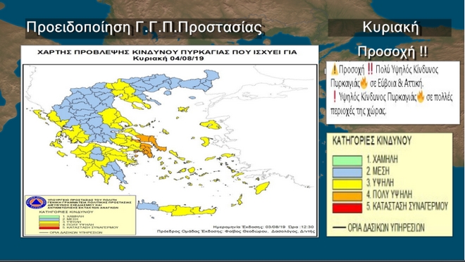 Από πλευράς επικινδυνότητας πυρκαγιών, την Κυριακή θα έχουμε πολύ υψηλό κίνδυνο πυρκαγιάς για Εύβοια και Αττική. Ενώ επίσης υψηλός Κίνδυνος Πυρκαγιάς θα υπάρχει και σε πολλές περιοχές της χώρας, σύμφωνα με την πρόβλεψη της Γενικής Γραμματείας Πολιτικής Προστασίας.