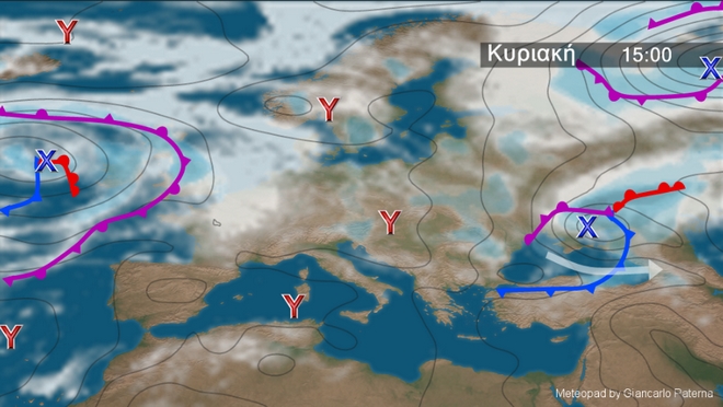Στον γενικό χάρτη της Ευρώπης διακρίνεται το ισχυρό βαρομετρικό χαμηλό στα δυτικά τμήματα και το άλλο χαμηλό που πέρασε από την Βαλκανική και το οποίο με το ψυχρό του μέτωπο έριξε τη θερμοκρασία στη χώρα μας .