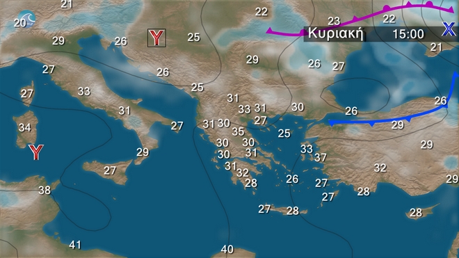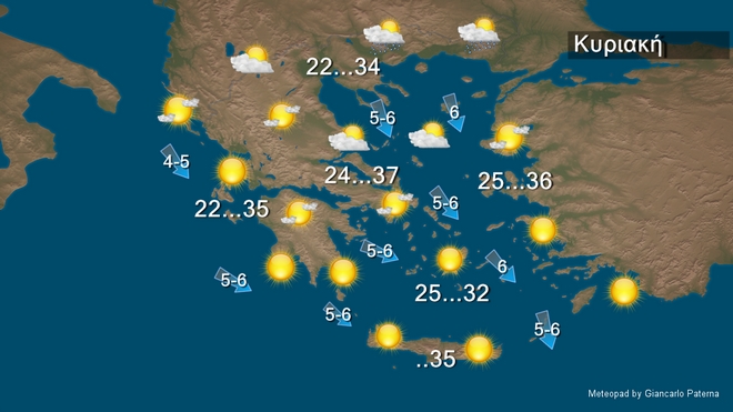 Θερμοκρασία: Από 25 έως 35 βαθμούς Κελσίου. Στα παραθαλάσσια η μέγιστη θα είναι 2 με 3 βαθμούς χαμηλότερη.