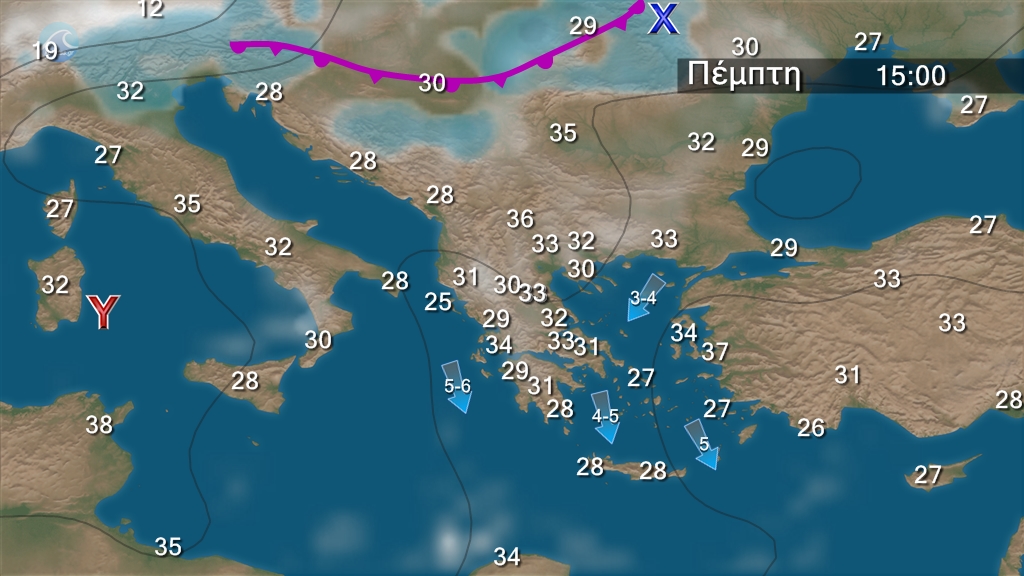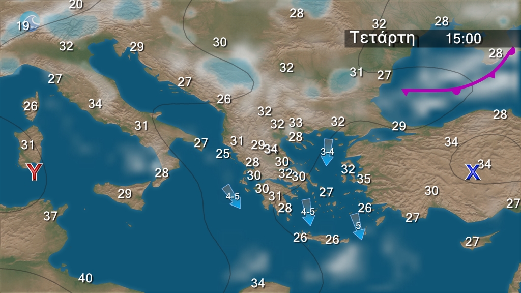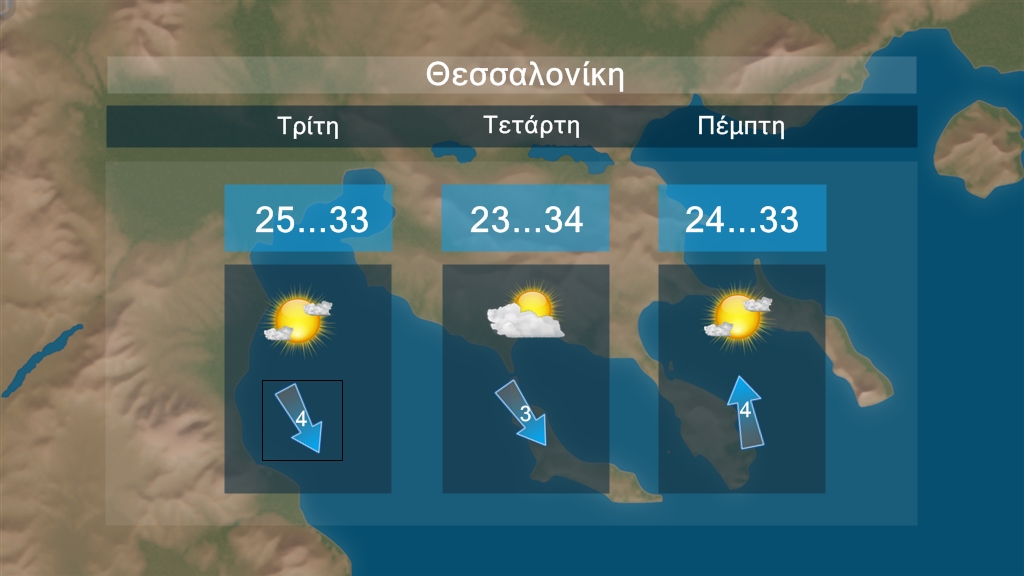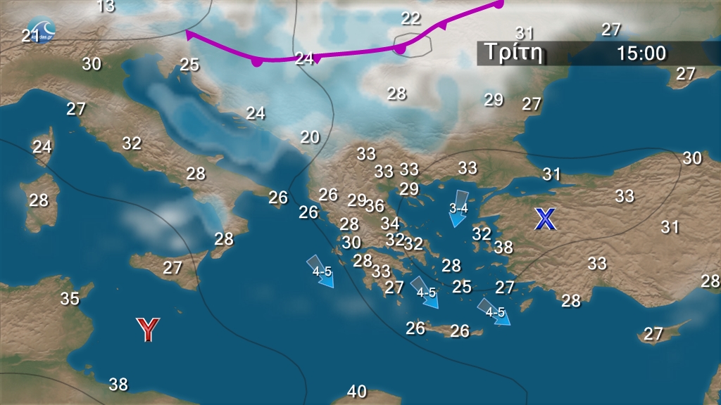 Γενικά αίθριος καιρός. Πρόσκαιρες νεφώσεις τις μεσημβρινές και απογευματινές ώρες στα ηπειρωτικά ορεινά με πιθανότητα τοπικών όμβρων στα βορειοανατολικά ορεινά. Οι άνεμοι θα πνέουν από βόρειες διευθύνσεις 3 με 5 και τοπικά στο Αιγαίο 6 μποφόρ. Η θερμοκρασία χωρίς αξιόλογη μεταβολή.