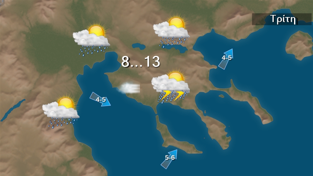Επιδείνωση του καιρού με βροχές και καταιγίδες, κυρίως στα θαλάσσια-παραθαλάσσια τμήματα αρχικά στο Ιόνιο και τα ηπειρωτικά και σταδιακά στην υπόλοιπη νησιωτική χώρα. Τα φαινόμενα θα είναι κατά τόπους ισχυρά και θα συνοδεύονται από μεγάλη συχνότητα κεραυνών και τοπικά χαλαζοπτώσεις τις πρωινές ώρες στην Ήπειρο και μέχρι το μεσημέρι στο Ιόνιο, τη δυτική Στερεά και τη δυτική Πελοπόννησο. Από τις προμεσημβρινές μέχρι και τις βραδινές ώρες τα ισχυρά φαινόμενα θα επηρεάσουν τη Θράκη, την ανατολική Μακεδονία και τα νησιά του βορείου και ανατολικού Αιγαίου και από τις απογευματινές ώρες τα Δωδεκάνησα ενώ πρόσκαιρα το μεσημέρι-απόγευμα τις Κυκλάδες και την Κρήτη. Χιόνια θα πέσουν στα ηπειρωτικά ορεινά. Οι άνεμοι στα δυτικά θα πνέουν από δυτικές διευθύνσεις 6 με 8 μποφόρ και στα ανατολικά νότιοι νοτιοδυτικοί 5 με 7 και στο Αιγαίο 8 τοπικά 9 μποφόρ με σταδιακή εξασθένηση από το απόγευμα. Η θερμοκρασία δε θα σημειώσει αξιόλογη μεταβολή. Στα βόρεια θα φτάσει τους 10 με 13 βαθμούς Κελσίου, στα υπόλοιπα ηπειρωτικά τους 13 με 16 και στη νησιωτική χώρα τους 17 με 19 βαθμούς Κελσίου.