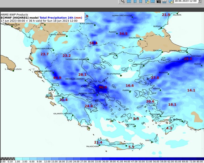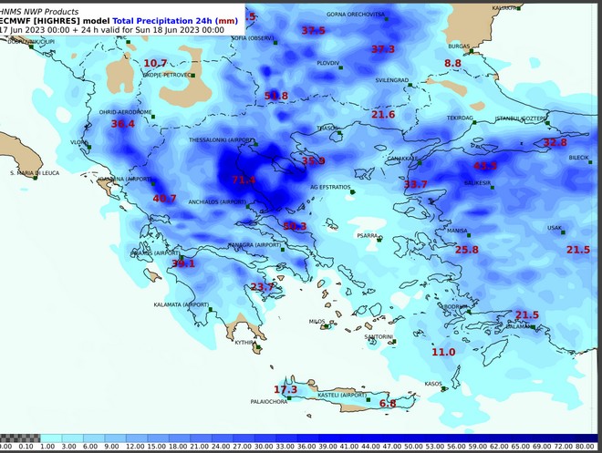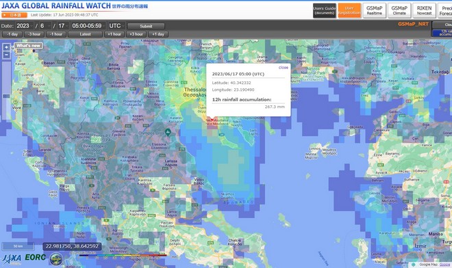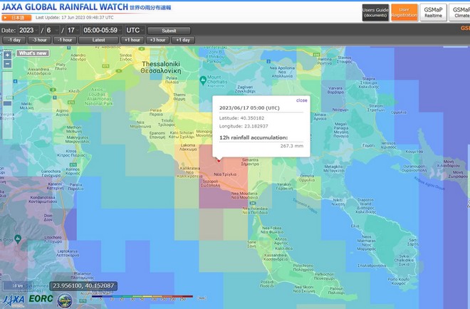 Το Σάββατο 17/6/2023 οι σταθμοί της ΕΜΥ στη Θεσσαλονίκη και την Μυτιλήνη κατέγραψαν 37 και 34 mm βροχής, ενώ οι σταθμοί του ΕΑΑ/Meteo ύψη μεταξύ 60 και 80 mm. Όσο και να μας φανεί παράξενο στη Χαλκιδική ο δορυφόρος της κατέγραψε 267.3 mm σε ένα δωδεκάωρο που επιβεβαιώνεται με τις αντίστοιχες δορυφορικές μετρήσεις του Eumetsat