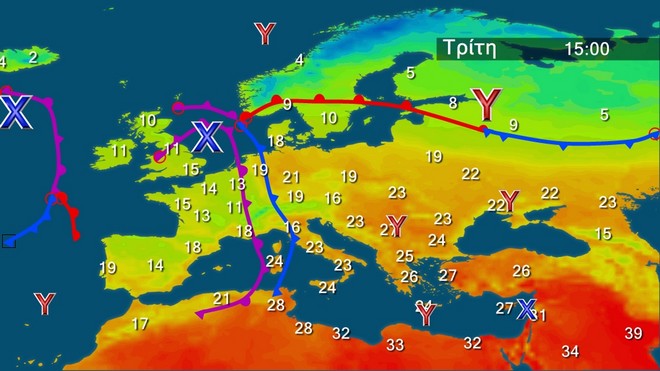 Στον γενικό χάρτη της Ευρώπης διακρίνονται ισχυρά βαρομετρικά χαμηλά στα δυτικά και Βόρεια τμήματα της Ευρώπης . Ένας εκτεταμένος αντικυκλώνας καλύπτει τα κεντρικά και νότια που επεκτείνεται ανατολικότερα και αυτό θα έχει σαν αποτέλεσμα να επικρατήσει αίθριος καιρός στη χώρα.