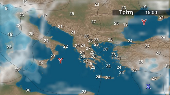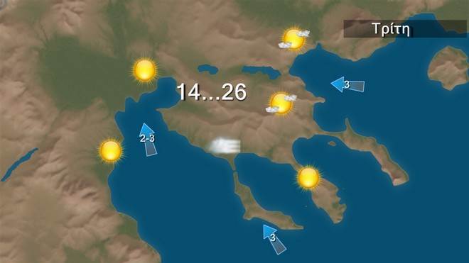 Την Τρίτη θα έχουμε γενικά αίθριο καιρό Τοπικά περιορισμένη ορατότητα ή ομίχλες στο Ιόνιο και τα ηπειρωτικά τις πρωινές και βραδινές ώρες. Οι άνεμοι θα πνέουν από βόρειες διευθύνσεις 3 με 4, στο Αιγαίο 4 με 5 μποφόρ. Η θερμοκρασία θα σημειώσει μικρή άνοδο ως προς τις μέγιστες τιμές και θα φτάσει τους 28 βαθμούς στα βόρεια , στα υπόλοιπα ηπειρωτικά και το Ιόνιο τους 29 και στα νησιά του Αιγαίου τους 26 με 29 βαθμούς Κελσίου.