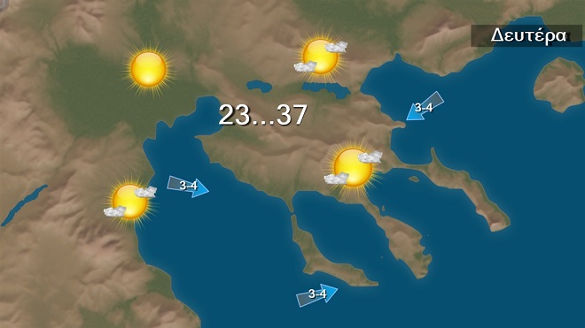 Τη Δευτέρα προβλέπεται γενικά αίθριος καιρός, με λίγες πρόσκαιρες νεφώσεις στα κεντρικά και βόρεια ορεινά τις μεσημβρινές και απογευματινές ώρες. Οι άνεμοι θα πνέουν από βόρειες διευθύνσεις 3 με 5 μποφόρ, στα ανατολικά έως 6 και στο ανατολικό Αιγαίο τοπικά 7 μποφόρ. Η θερμοκρασία προβλέπεται να υποχωρήσει κατά 2 με 5 βαθμούς Κελσίου, με τη μεγαλύτερη πτώση να παρατηρείται στην ανατολική χώρα και τη μικρότερη στη δυτική.