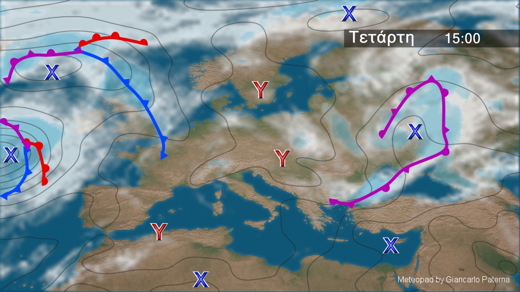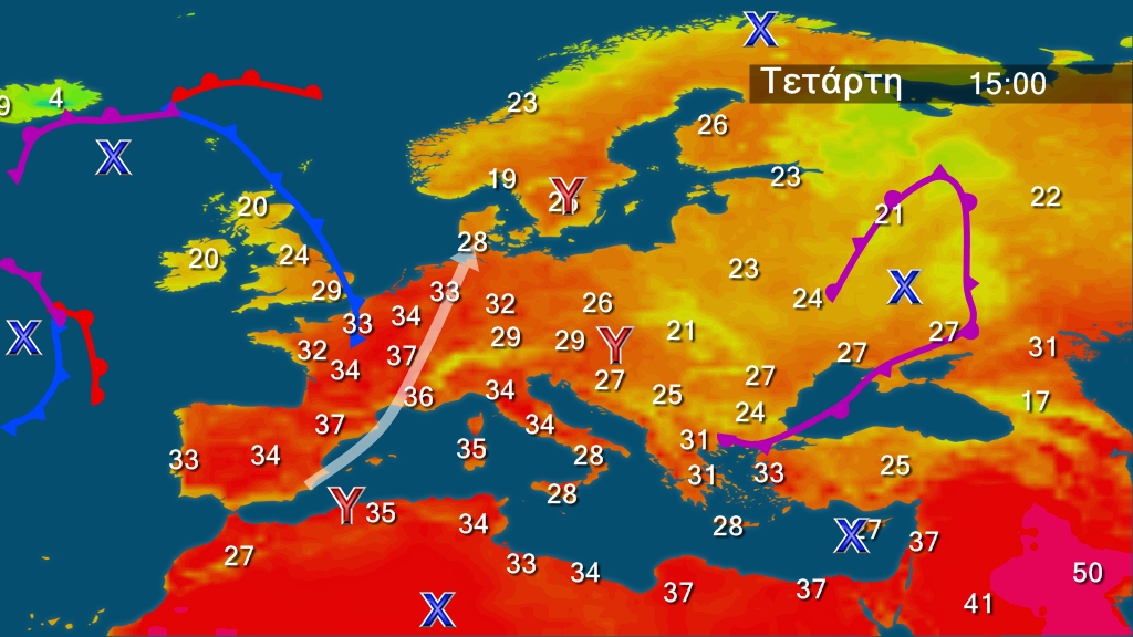 Στον γενικό χάρτη της Ευρώπης διακρίνονται τα χαμηλά που επηρεάζουν τη Βορειοδυτική και Βορειοανατολική Ευρώπη. To ισχυρό Νοτιοδυτικό ρεύμα στη Δυτική Ευρώπη προκαλεί έντονη θερμή μεταφορά με αποτέλεσμα να έχουμε το επόμενο τετραήμερο ένα ισχυρότατο κύμα ζέστης στα δυτικά και κεντρικά τμήματα της Ευρώπης.