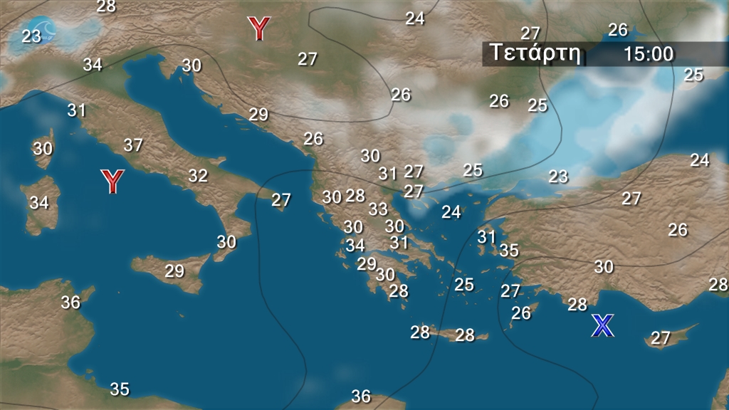Την Τετάρτη προβλέπεται γενικά αίθριος καιρός με πρόσκαιρες νεφώσεις στα ηπειρωτικά τις μεσημβρινές και απογευματινές ώρες, οπότε θα εκδηλωθούν τοπικοί όμβροι στα κεντρικά και βόρεια ορεινά . Οι άνεμοι θα πνέουν από βόρειες διευθύνσεις στο Αιγαίο 5-6 και από το απόγευμα 6 και τοπικά έως 7 μποφόρ. Η θερμοκρασία θα φτάσει κατά τόπους στα ηπειρωτικά τους 35 με 36 βαθμούς Κελσίου και στα νησιά του Αιγαίου τους 30 με 34 βαθμούς Κελσίου.
