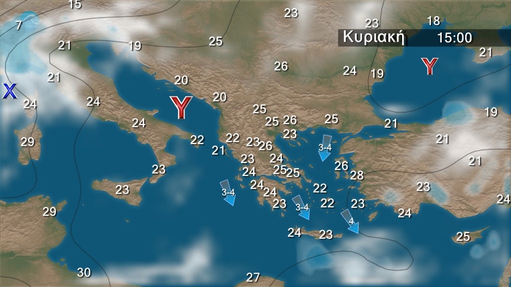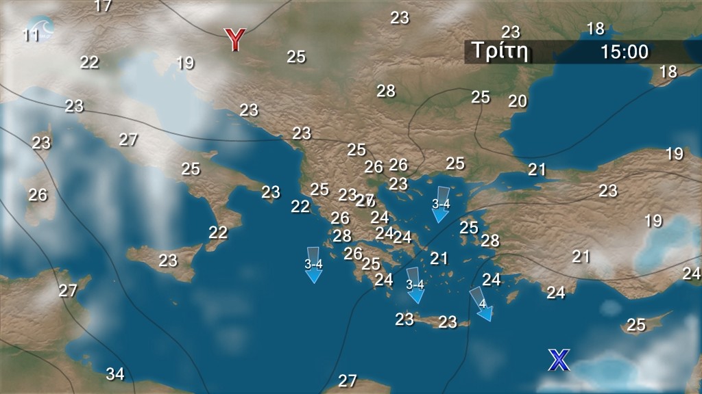 Γενικά αίθριος καιρός με λίγες τοπικές νεφώσεις στα ανατολικά ηπειρωτικά και την Κρήτη. Τοπικά περιορισμένη ορατότητα ή ομίχλες τις πρωινές ώρες στο Ιόνιο και τα ηπειρωτικά. Οι άνεμοι θα πνέουν από βόρειες διευθύνσεις, στα δυτικά 3 με 4, στα ανατολικά 4 με 5 και στο Αιγαίο τοπικά 6 μποφόρ. Η θερμοκρασία δεν θα σημειώσει αξιόλογη μεταβολή.