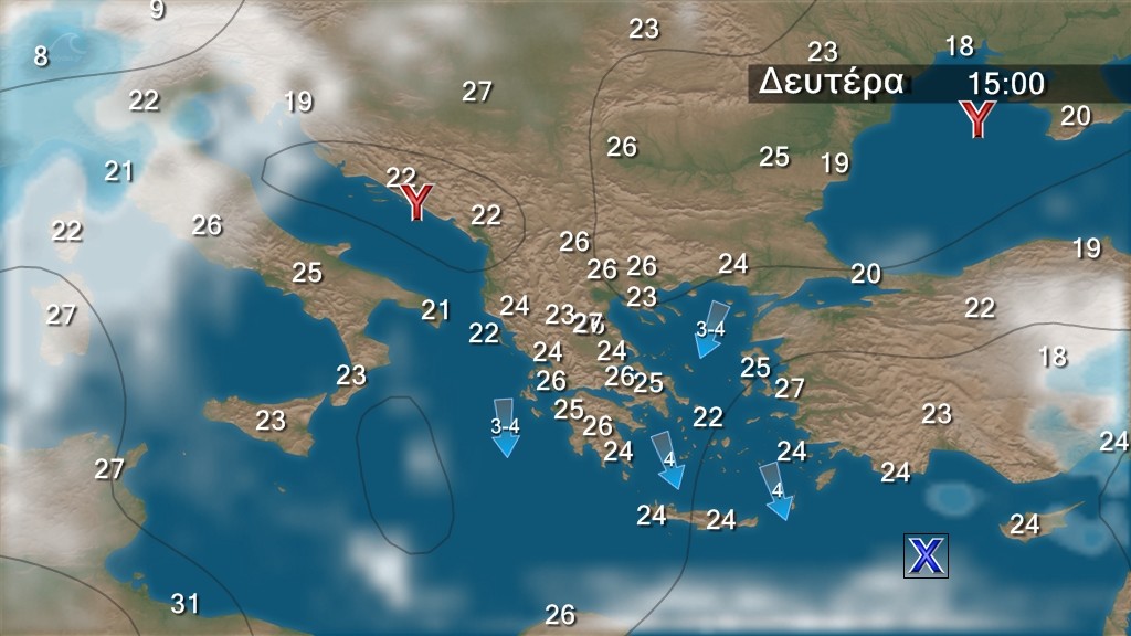 ΤΡΙΤΗ 22-10-2019, ΤΕΤΑΡΤΗ 23-10-2019 και ΠΕΜΠΤΗ 24-10-2019 Γενικά αίθριος καιρός και μόνο στα ανατολικά και νότια θα υπάρχουν κατά διαστήματα αυξημένες νεφώσεις και στην Κρήτη και τα Δωδεκάνησα θα εκδηλωθούν βροχές. Οι άνεμοι θα πνέουν από βόρειες διευθύνσεις 3 με 5 και στο Αιγαίο 6 και τοπικά 7 μποφόρ, με βαθμιαία εξασθένηση την Πέμπτη. Η θερμοκρασία θα σημειώσει μικρή πτώση στα ανατολικά.