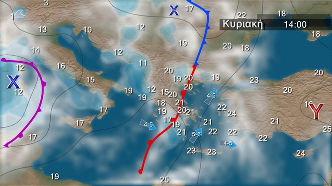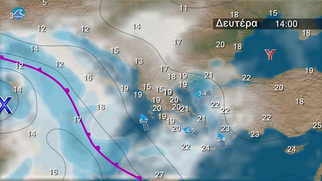 Στα νησιά του ανατολικού Αιγαίου και τα Δωδεκάνησα νεφώσεις με τοπικές βροχές και πιθανώς μεμονωμένες καταιγίδες και γρήγορη βελτίωση. Στις υπόλοιπες περιοχές αραιές νεφώσεις κατά τόπους πιο πυκνές. Τοπικά περιορισμένη ορατότητα και πιθανώς ομίχλη τις πρωινές και βραδινές ώρες, κυρίως στα ηπειρωτικά. Οι άνεμοι στα νησιά του ανατολικού Αιγαίου και τα Δωδεκάνησα θα πνέουν νότιοι νοτιοανατολικοί 5 με 6 μποφόρ με βαθμιαία εξασθένηση. Στις υπόλοιπες περιοχές αρχικά θα είναι μεταβλητοί 3 με 4 μποφόρ, βαθμιαία και από τα δυτικά θα γίνουν ανατολικοί νοτιοανατολικοί 3 με 5 και στο Ιόνιο από το βράδυ 6 με 7 μποφόρ. Η θερμοκρασία δε θα σημειώσει αξιόλογη μεταβολή.
