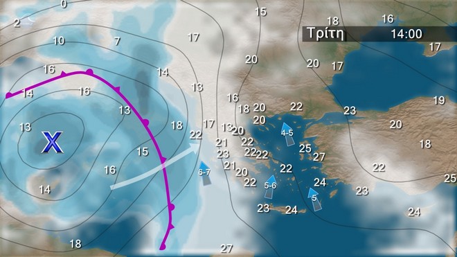 Νεφώσεις με τοπικές βροχές και σποραδικές καταιγίδες αρχικά στα δυτικά και βαθμιαία και στις υπόλοιπες περιοχές. Τα φαινόμενα είναι πιθανό να είναι κατά τόπους ισχυρά, κυρίως στα δυτικά και την Πελοπόννησο μέχρι το μεσημέρι, στην ανατολική Μακεδονία και τη Θράκη από το απόγευμα και στα νησιά του ανατολικού Αιγαίου από το βράδυ. Βαθμιαία και από τα δυτικά ο καιρός θα βελτιωθεί στις περισσότερες περιοχές και τη νύχτα τα φαινόμενα θα περιοριστούν στην ανατολική νησιωτική χώρα και τη Θράκη. Οι άνεμοι θα πνέουν αρχικά νότιοι νοτιοανατολικοί 5 με 6 και στο Ιόνιο τοπικά 7 μποφόρ, όμως γρήγορα στα δυτικά και βαθμιαία και στα υπόλοιπα ηπειρωτικά και το δυτικό Αιγαίο θα στραφούν σε δυτικούς νοτιοδυτικούς 4 με 6 μποφόρ, με σταδιακή εξασθένηση. Η θερμοκρασία θα σημειώσει μικρή πτώση κυρίως στα δυτικά.