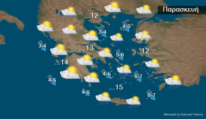 Νεφώσεις παροδικά αυξημένες με τοπικές βροχές εκτός της ανατολικής Μακεδονίας και της Θράκης και στα νησιά του ανατολικού Αιγάιου, τα Δωδεκάνησα, τις Κυκλάδες και την Κρήτη σποραδικές καταιγίδες. Χιονοπτώσεις θα σημειωθούν στα ηπειρωτικά ορεινά καθώς και σε ημιορεινές περιοχές της κεντρικής και βόρειας χώρας. Τα φαινόμενα τις βραδινές ώρες θα περιοριστούν στα νοτιοανατολικά και θα εξασθενήσουν.