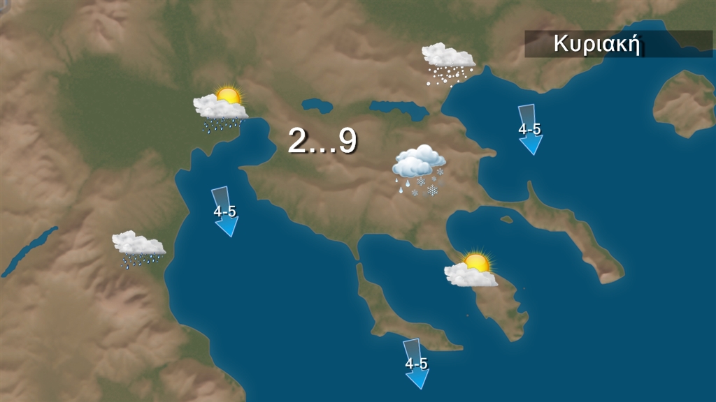 Την Κυριακή προβλέπονται νεφώσεις παροδικά αυξημένες, με τοπικές βροχές κυρίως στη Μακεδονία, τη Θράκη, την ανατολική Θεσσαλία, την ανατολική Στερεά, την Εύβοια, τις Σποράδες και τα νησιά του βορείου Αιγαίου. Παροδικές χιονοπτώσεις θα σημειωθούν στα ορεινά. Τοπικά περιορισμένη θα είναι η ορατότητα τις πρωινές και βραδινές ώρες στα ηπειρωτικά.