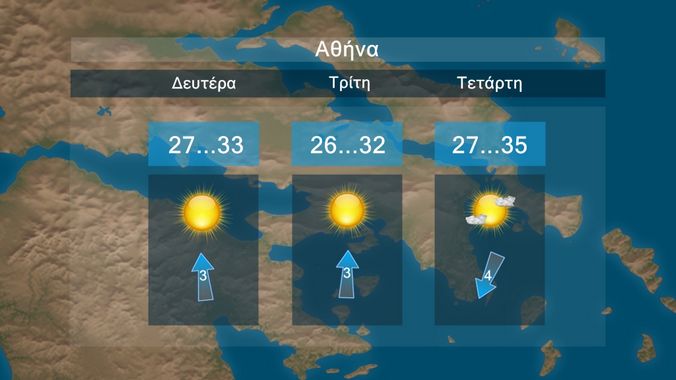 Στην Αθήνα προβλέπεται σχεδόν αίθριος καιρός. Η θερμοκρασία θα έχει μέγιστες τιμές περί τους 32 με 35 βαθμούς Κελσίου.