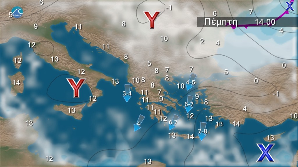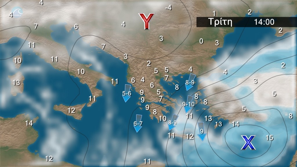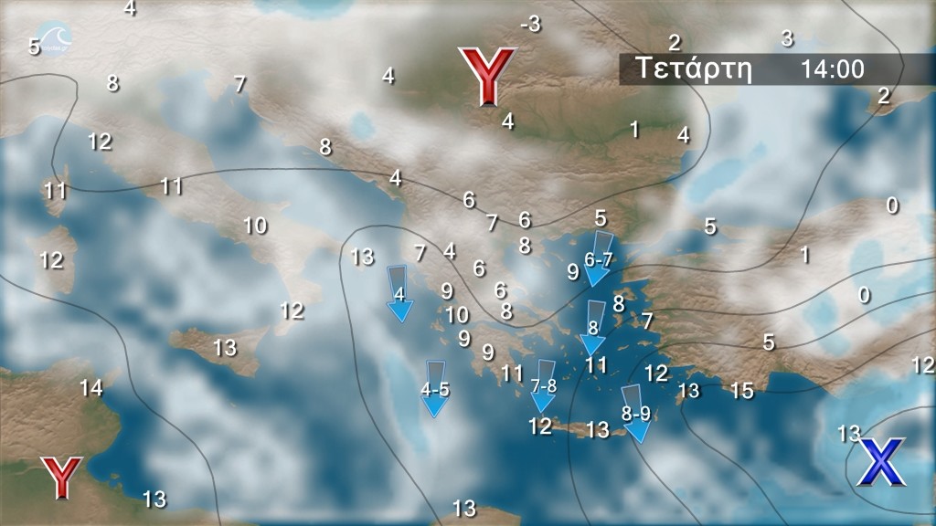 Νεφώσεις με βροχές ή χιονόνερο και κυρίως στα θαλάσσια και παραθαλάσσια καταιγίδες κατά τόπους ισχυρές. Χιονοπτώσεις θα σημειωθούν στα ορεινά, καθώς και σε περιοχές με χαμηλότερο υψόμετρο της ηπειρωτικής χώρας (στα πεδινά της Θεσσαλίας, Μακεδονίας και Θράκης). Κατά τόπους θα είναι πυκνές στην ανατολική Στερεά, την Εύβοια, τα νησιά του βορείου και ανατολικού Αιγαίου (ενδεικτικό υψόμετρο 200-400 μέτρα και πιθανώς και σε πεδινές περιοχές) και τα ορεινά-ημιορεινά της Κρήτης. Τα φαινόμενα στα βορειοδυτικά βαθμιαία θα εξασθενήσουν. Οι άνεμοι θα πνέουν στα Δωδεκάνησα νοτιοδυτικοί 5 με 7 μποφόρ στρεφόμενοι από το βράδυ σε βόρειους με την ίδια ένταση. Στα υπόλοιπα θα πνέουν από βόρειες διευθύνσεις 7 με 8 και στο Αιγαίο 9 και τοπικά 10 μποφόρ. Η θερμοκρασία θα σημειώσει πτώση και παγετός θα σημειωθεί κατά τόπους ισχυρός στα ηπειρωτικά, κυρίως στα κεντρικά και τα βόρεια, τις πρωινές και βραδινές ώρες.